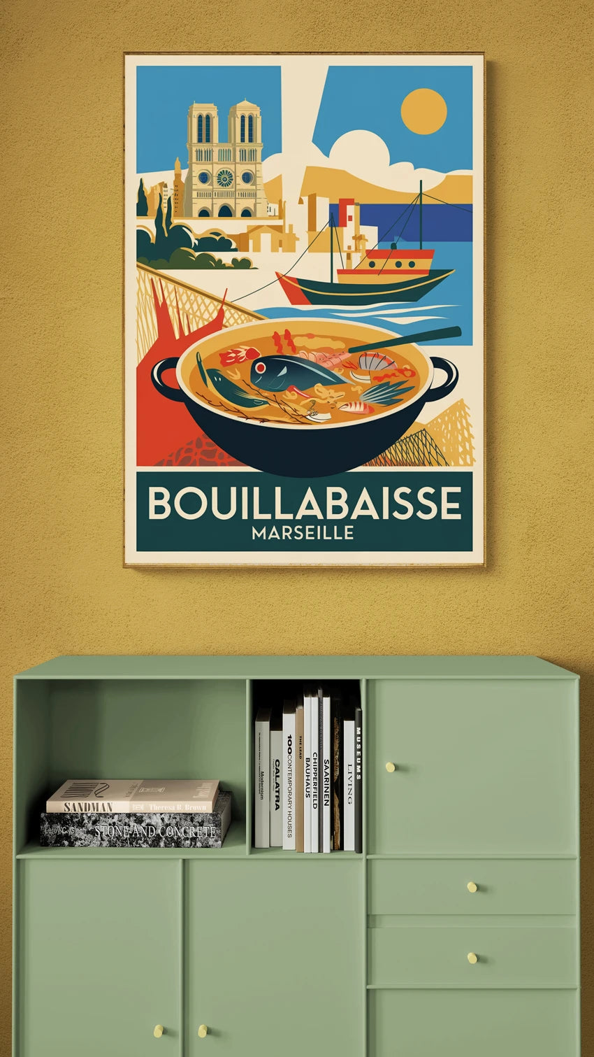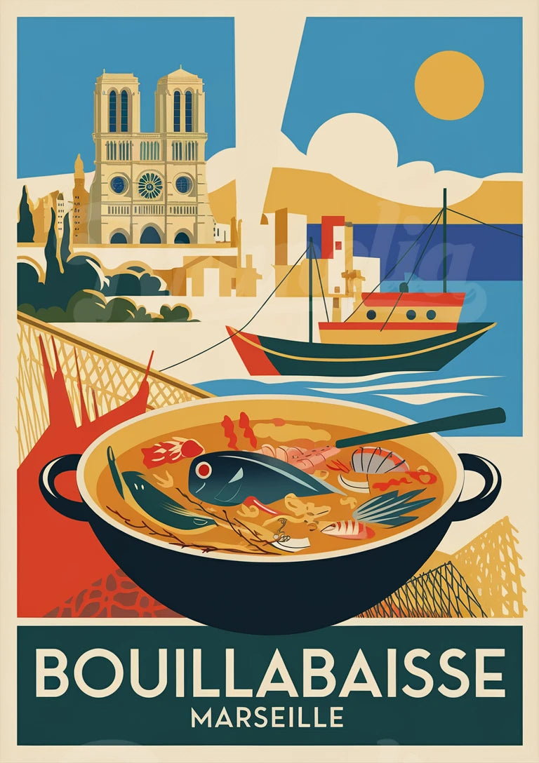 Affiche culinaire bouillabaisse – Scène méditerranéenne retro