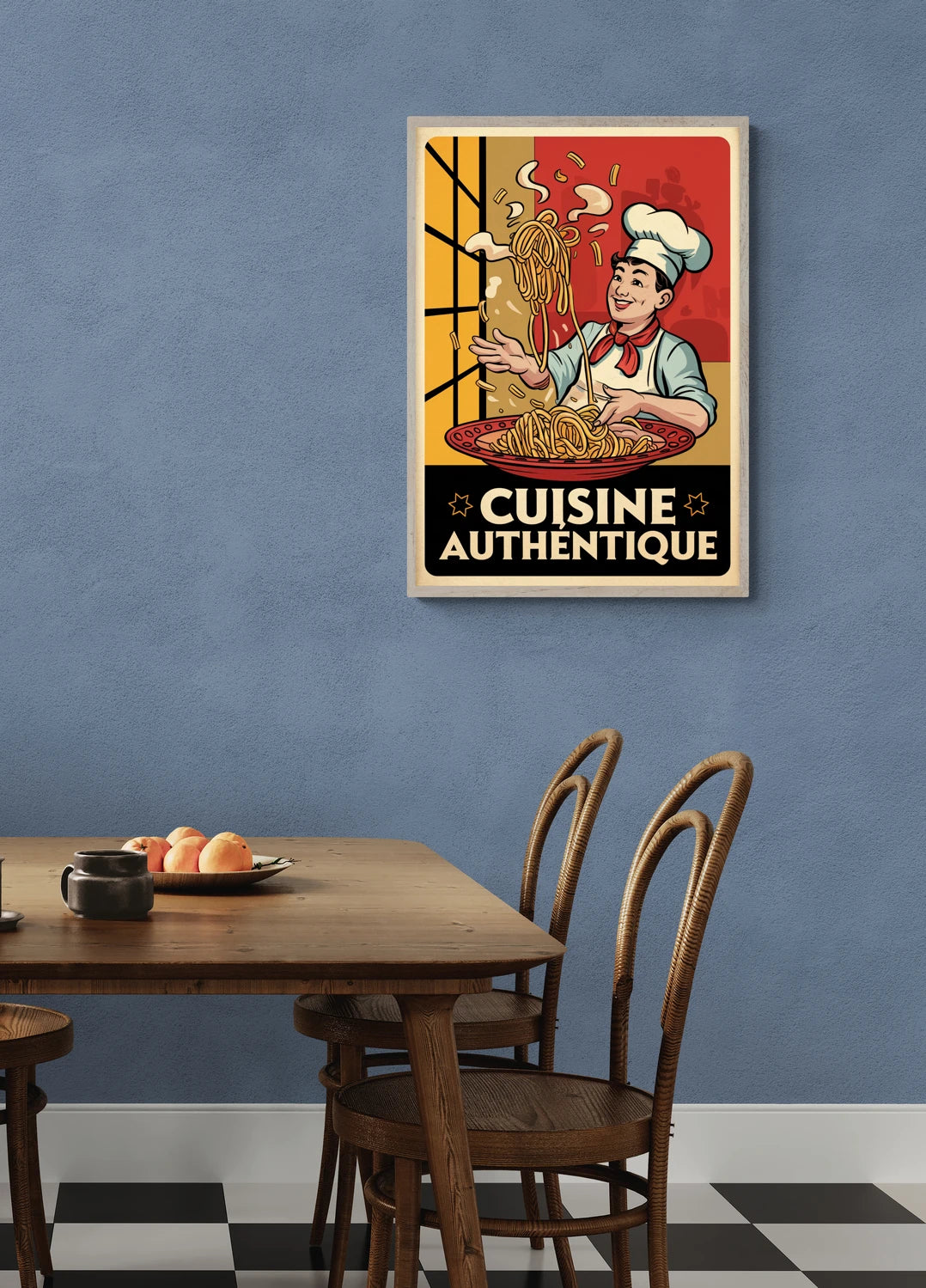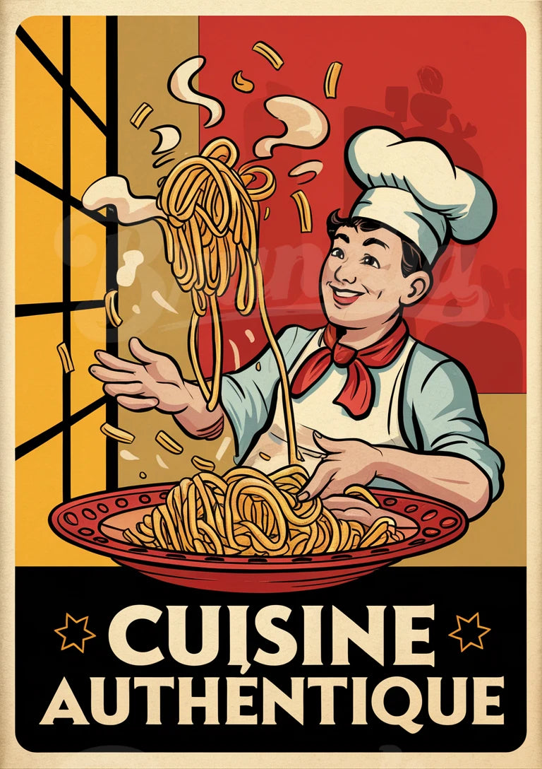 Affiche Chef Cuisinier Joyeux avec Plat de Pâtes