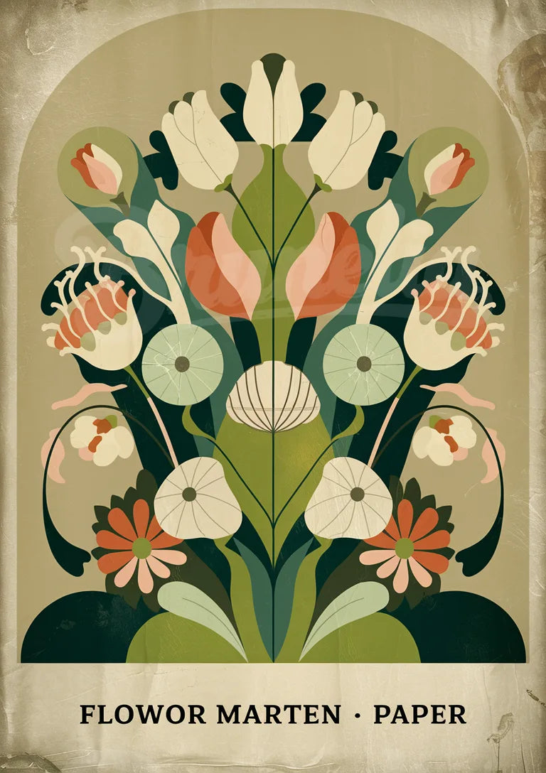 - Affiche graphique futuriste – Soleil radiant et paysage floral