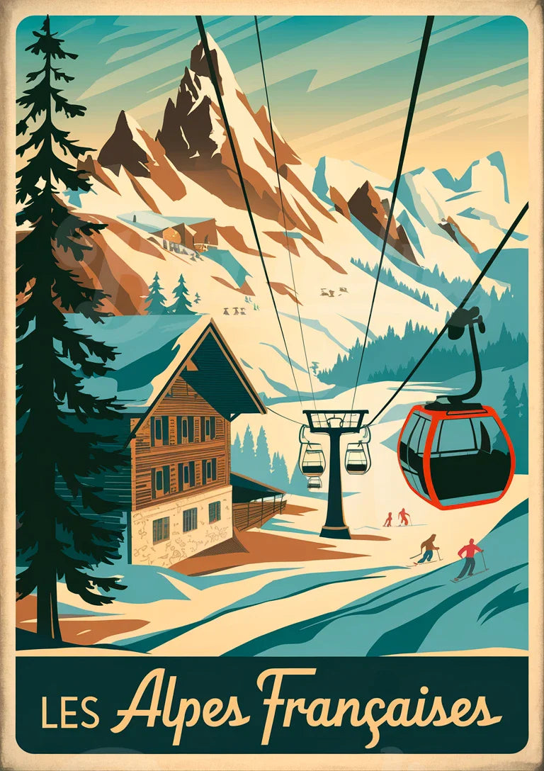 - Affiche illustrée – Chalet alpin et montagnes enneigées