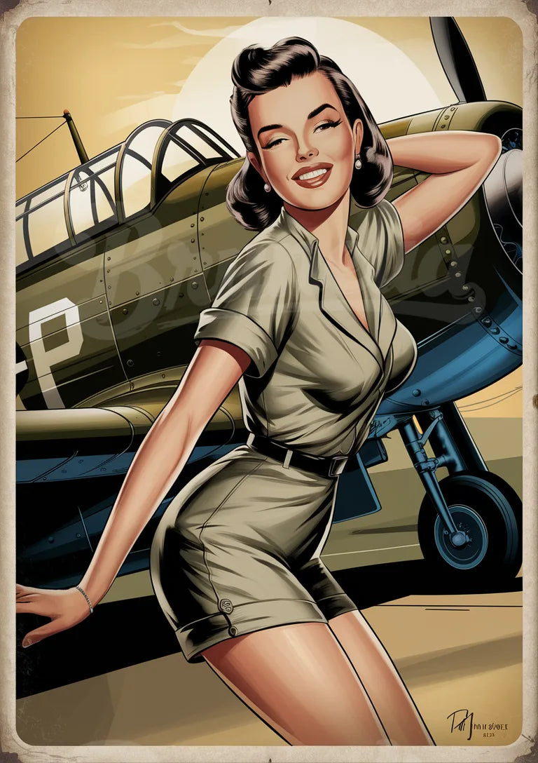 - Illustration rétro – Femme pin-up devant un avion militaire
