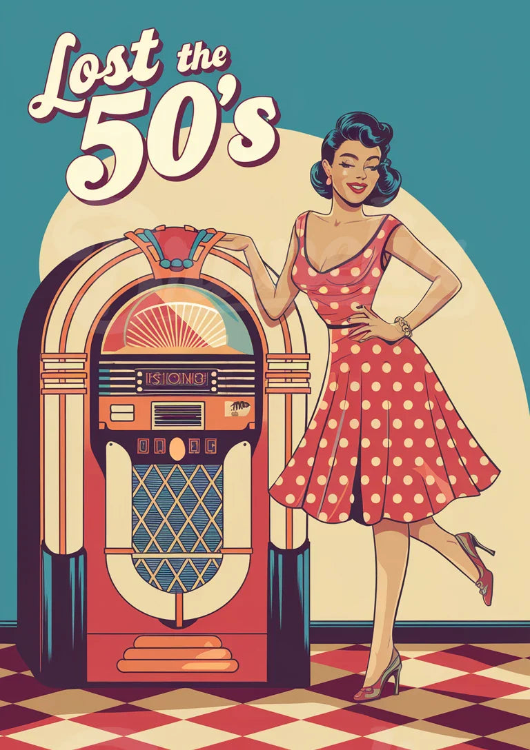 - Affiche rétro femme et jukebox - Années 50 colorées