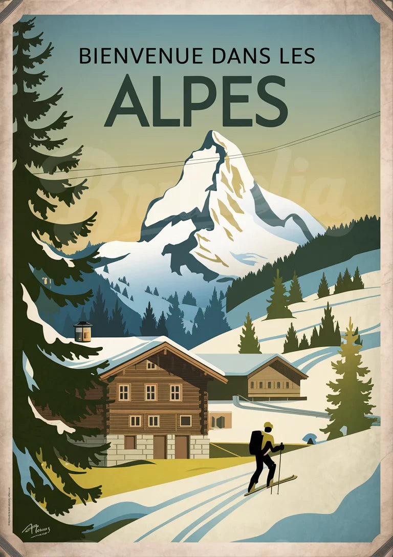 - Affiche rétro – Skieur et Chalets face aux Alpes enneigées